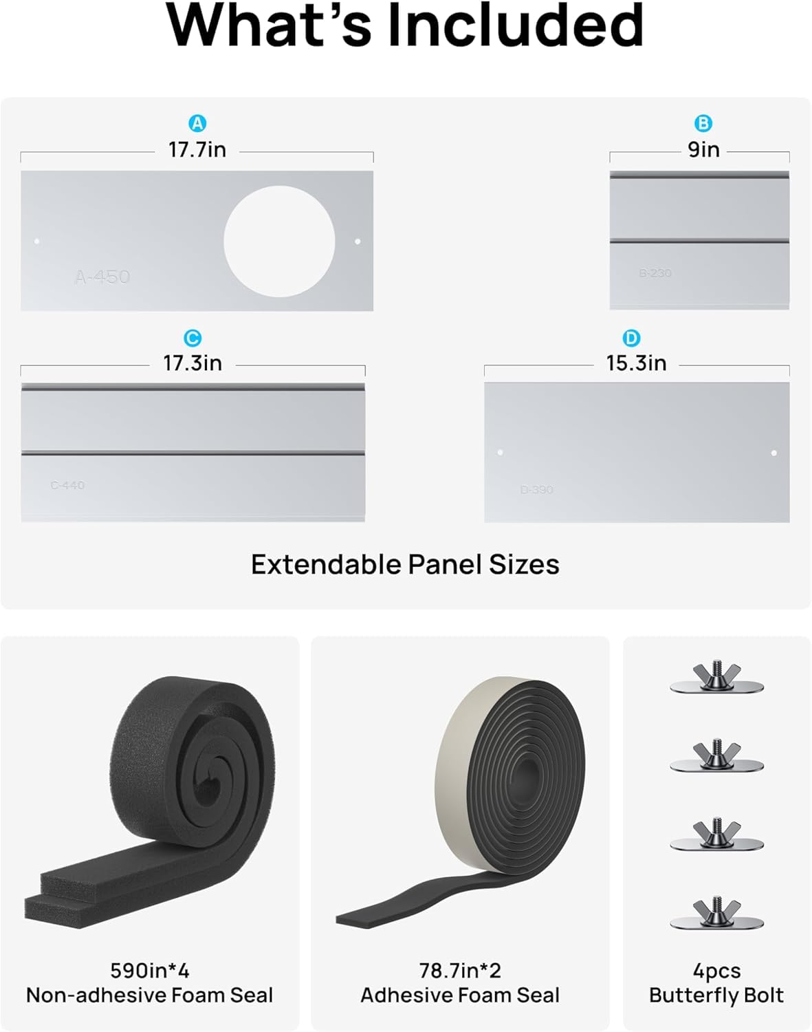 - Included in the Package: 1x Window Panel, 1x Window Extension Panel, 1x Window Extension Panel, 1x Window Extension Panel, 3x butterfly bolts, 4x 59-inch adhesive sealing, 2x 78-inch non-adhesive sealings, 1x 59-inch exhaust duct
