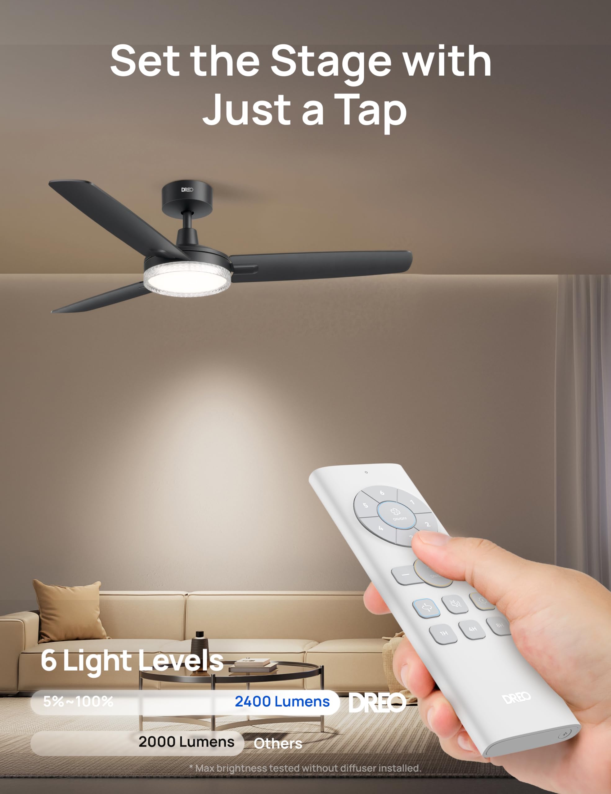 - Effortless Installation, Efficient Performance: DREO's pre-assembled ceiling fan with lights installs in 20 minutes with 4 steps. Watch our video for guidance. Free accessory replacement. Trust DREO, certified by FTC, ETL, DOE, for energy savings & reliability. Need help? We're here!