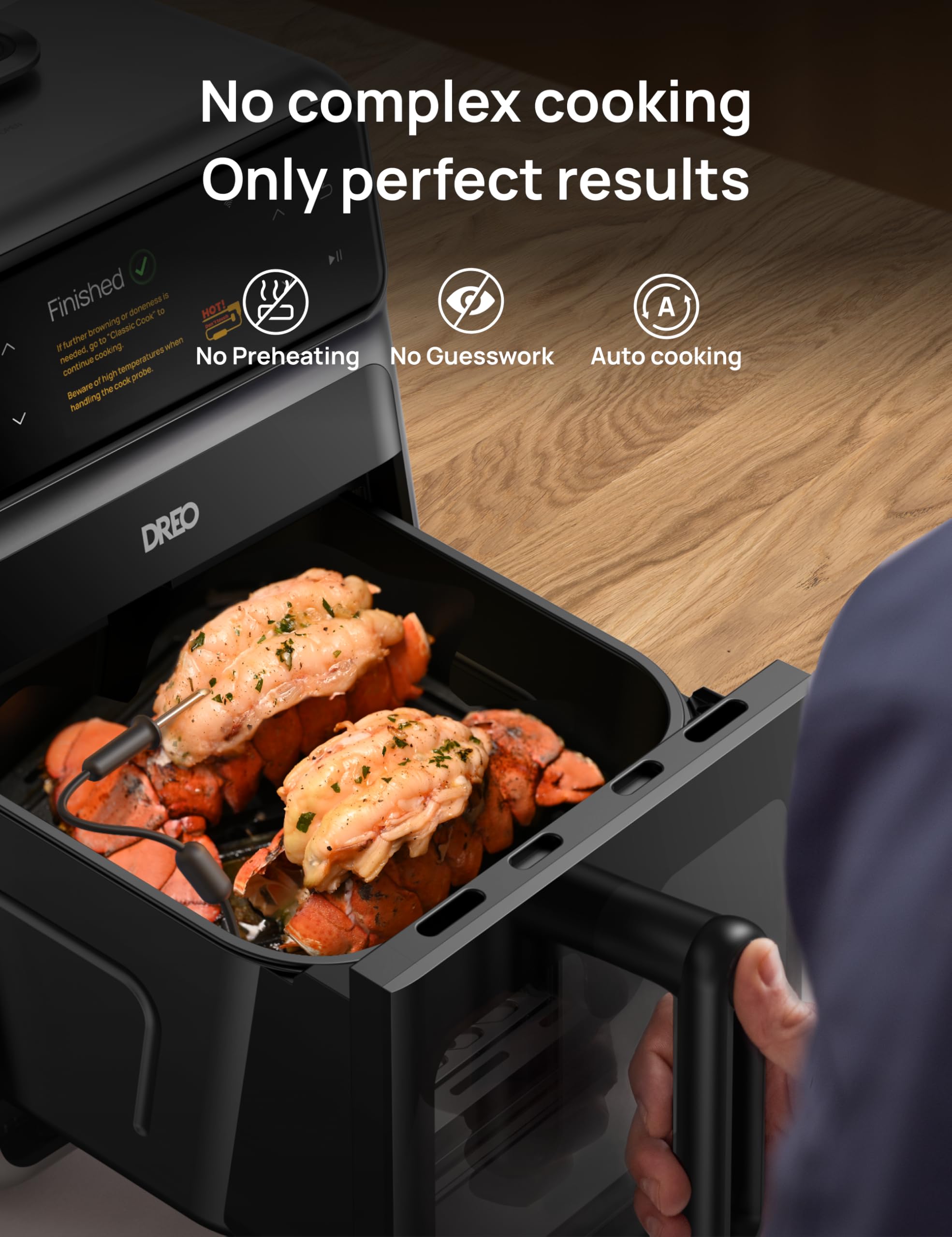 - Smart Cooking Experience: Cook at your own pace with step-by-step video-guided recipes, track the cooking process from anywhere with your smartphone, receive notifications when meals are finished, and save your favorite recipes for later. The Dreo app is the perfect companion to upgrade your cooking experience.