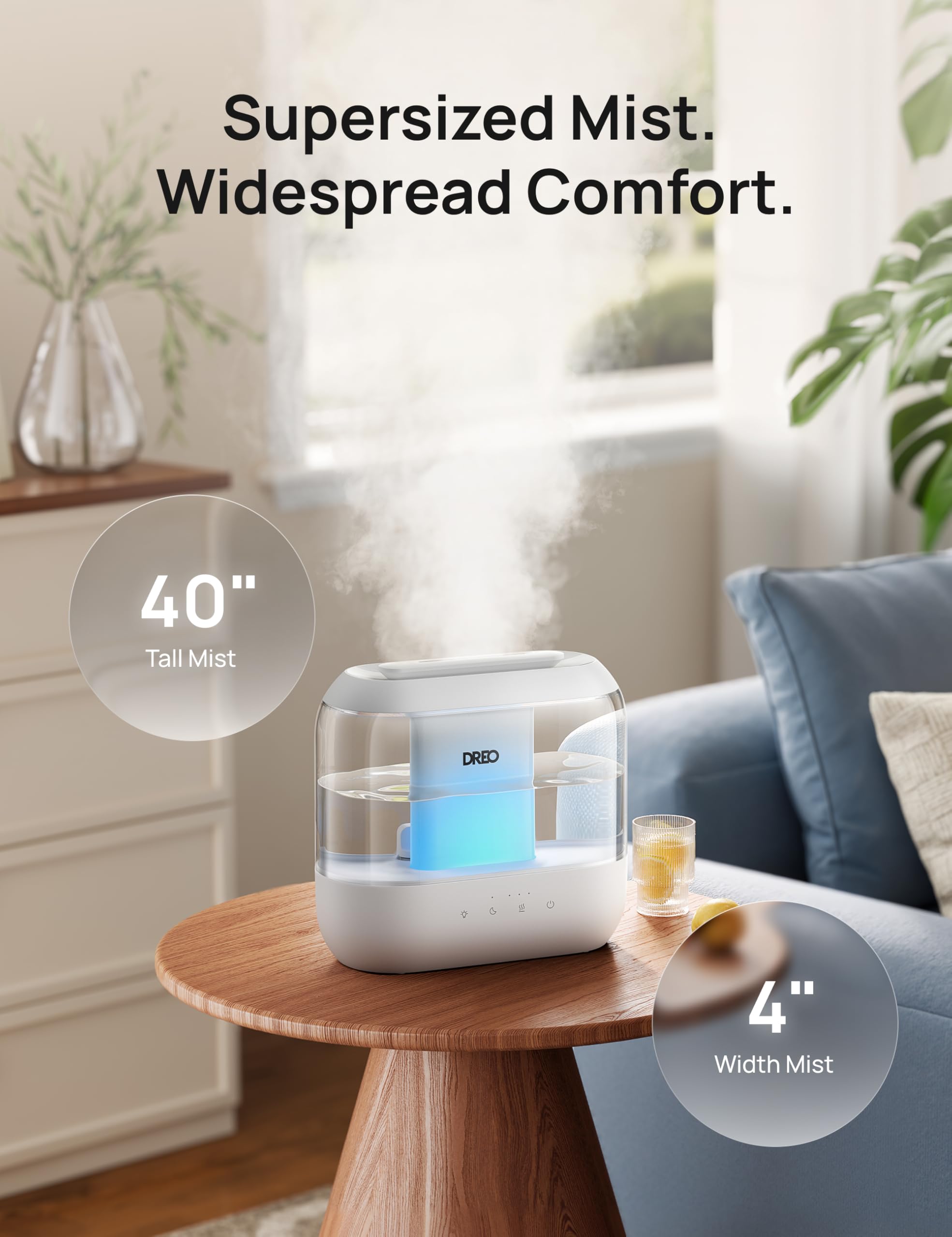 - ๐ก๐ฒ๐ ๐-๐๐ฒ๐ป ๐๐๐บ๐ถ๐ฑ๐ถ๐ณ๐ถ๐ฐ๐ฎ๐๐ถ๐ผ๐ป ๐ฃ๐ฒ๐ฟ๐ณ๐ผ๐ฟ๐บ๐ฎ๐ป๐ฐ๐ฒ: Powered by DREO's Dual-intake and 4-inch mist outlet design, this humidifier for large room creates a supersized mist of up to 40 inches tall for humidifying bedrooms, while bringing faster dry air relief to help you breathe easy and healthy.