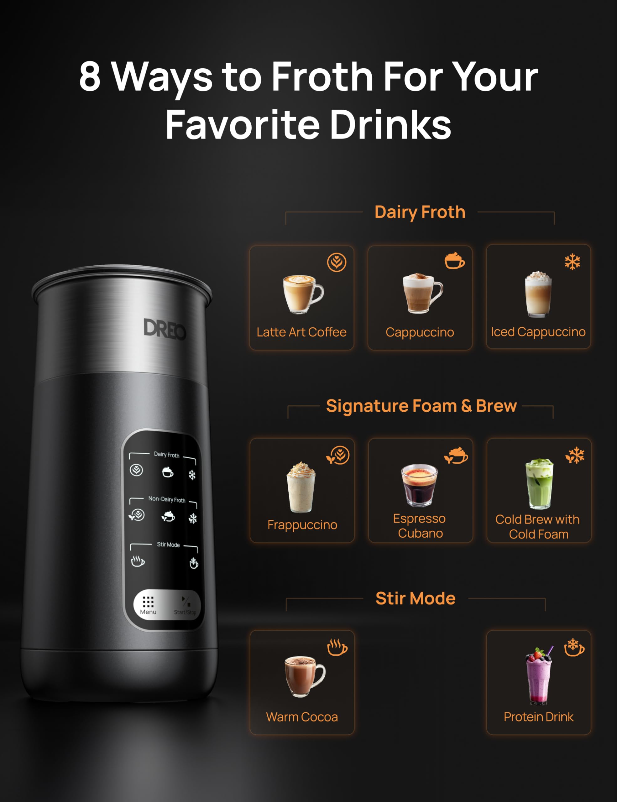 DREO Milk Frother, 8-in-1 Electric Stainless Steel Frother for Latte Art Microfoam and Coffee, 9oz/270ml Warm and Cold Foam Automatic Frothers, LED, Easy to Clean