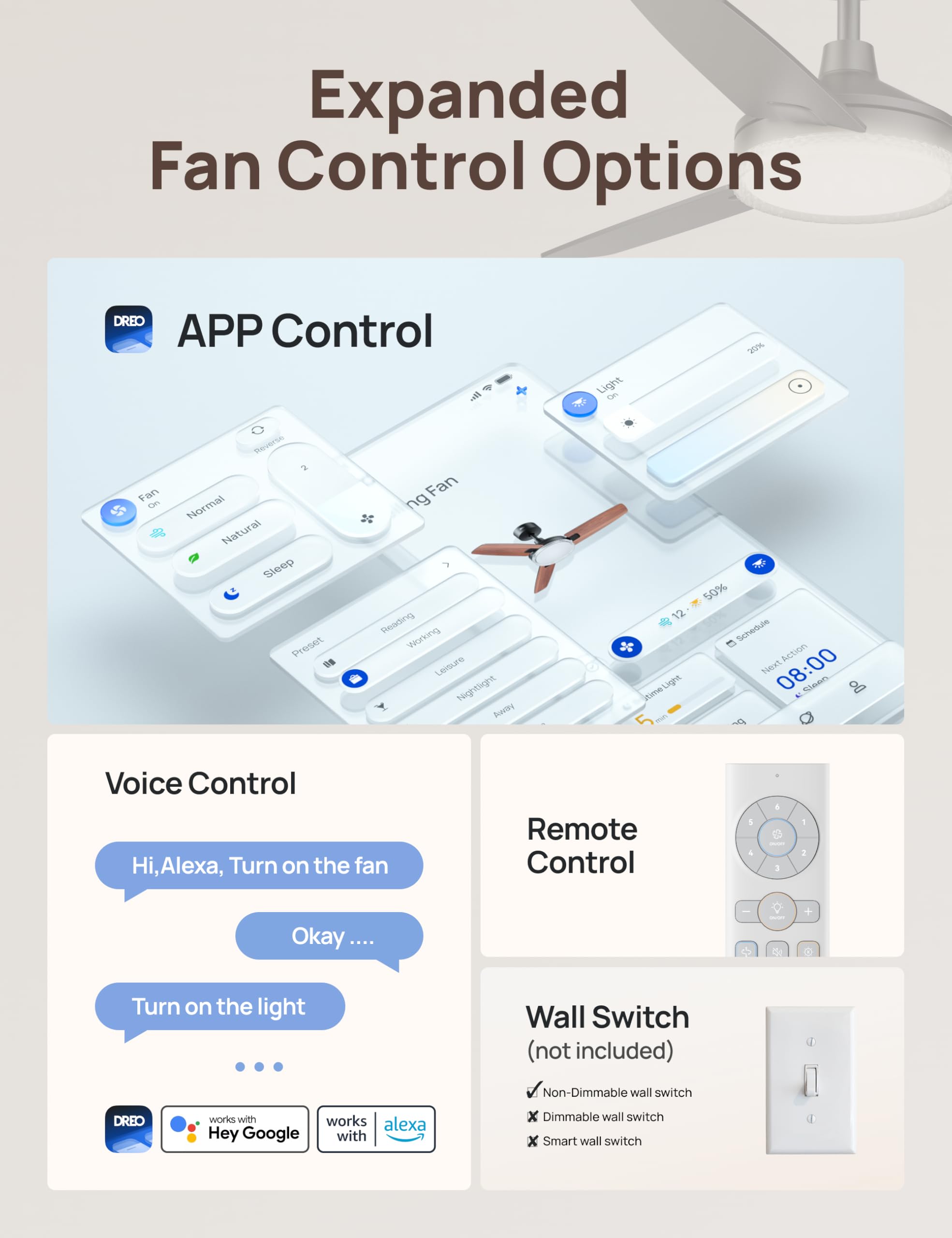 - Smart Ceiling Fan Experience: Switch fan speeds, scenes, brightness and timers using the DREO app, Alexa and Google home voice commands to tailor every setting to your needs.